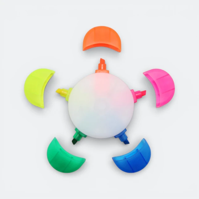 Brighten up your workspace with the Flower Highlighter, a fun and functional stationery item perfect for home, school, or office use. This plastic highlighter features a transparent white body designed in a flower shape, each petal offering a vibrant fluorescent ink color — pink, blue, orange, green, and yellow. The unique shape makes it easy to grip and ideal for multitasking.