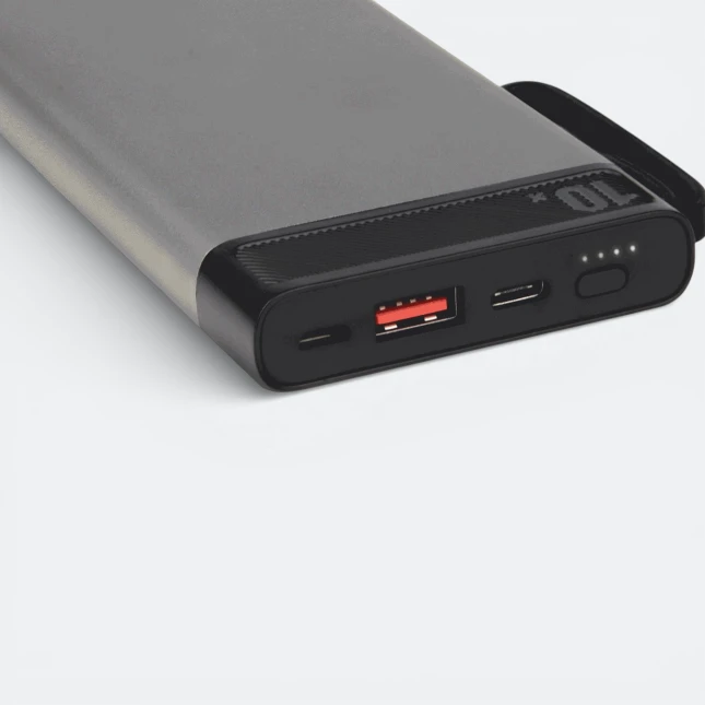 | Features | • 10000mAh high capacity portable power bank • Fast charging with PD22.5W and QC3.0 support • Dual output ports for charging multiple devices • LED indicator for battery level monitoring • Slim aluminium body with carry strap design • Ideal for corporate gifts and promotional branding |